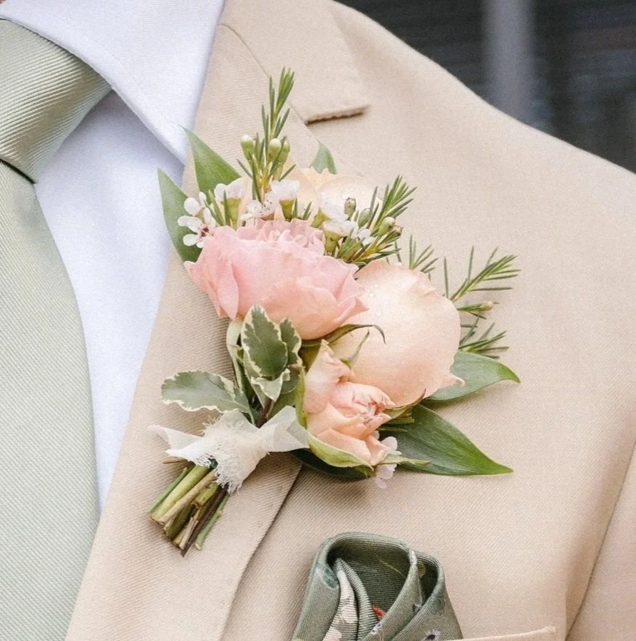 Boutonnieres are generally designed using spray roses which are a drought tolerant and hearty flower. A variety of filler and greens are available.